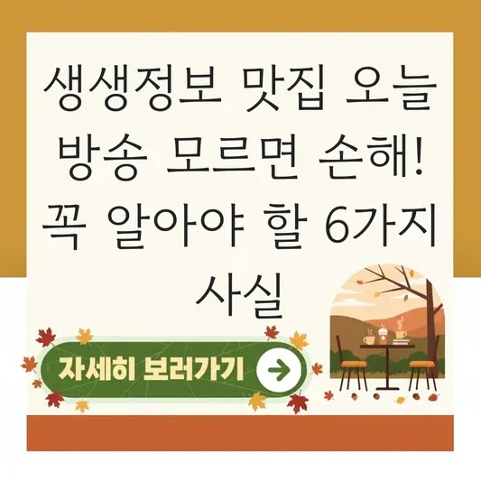 매일 저녁 7시만 되면 전국의 맛집 정보가 쏟아져 나옵니다. "생생정보"에 맛집이 소개될 때마다 검색창이 뜨겁게 달아오르지만, 정작 내가 가고 싶은 맛집 정보를 찾기란 쉽지 않습니다. 기업 컨설팅에서 비효율을 제거하듯, 맛집 정보도 핵심만 쏙 뽑아 정리해야 합니다. 오늘 방송 맛집을 빠르게 파악하고 낭비 없이 즐길 수 있는 방법을 제시합니다.