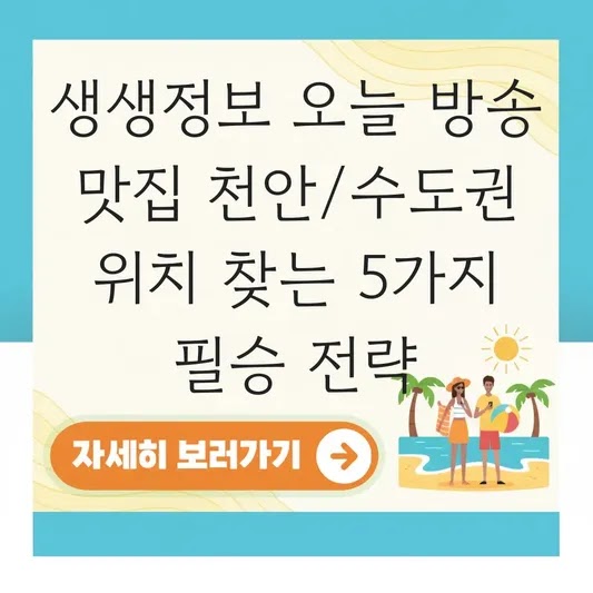 | 4. 지역별 맛집 리스트 확보 | 천안, 수도권 등 특정 지역의 생생정보 맛집 리스트를 미리 저장해 둡니다. | 특정 지역 방문 시 시간을 절약하며 효율적인 동선 계획이 가능합니다. |